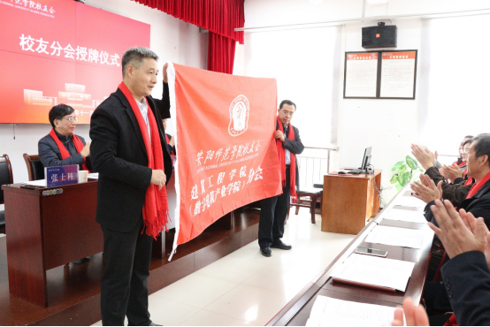在全场热烈的掌声中,副校长杨新宇为建筑工程学院校友分会授会旗和会牌,标志着分会正式成立。