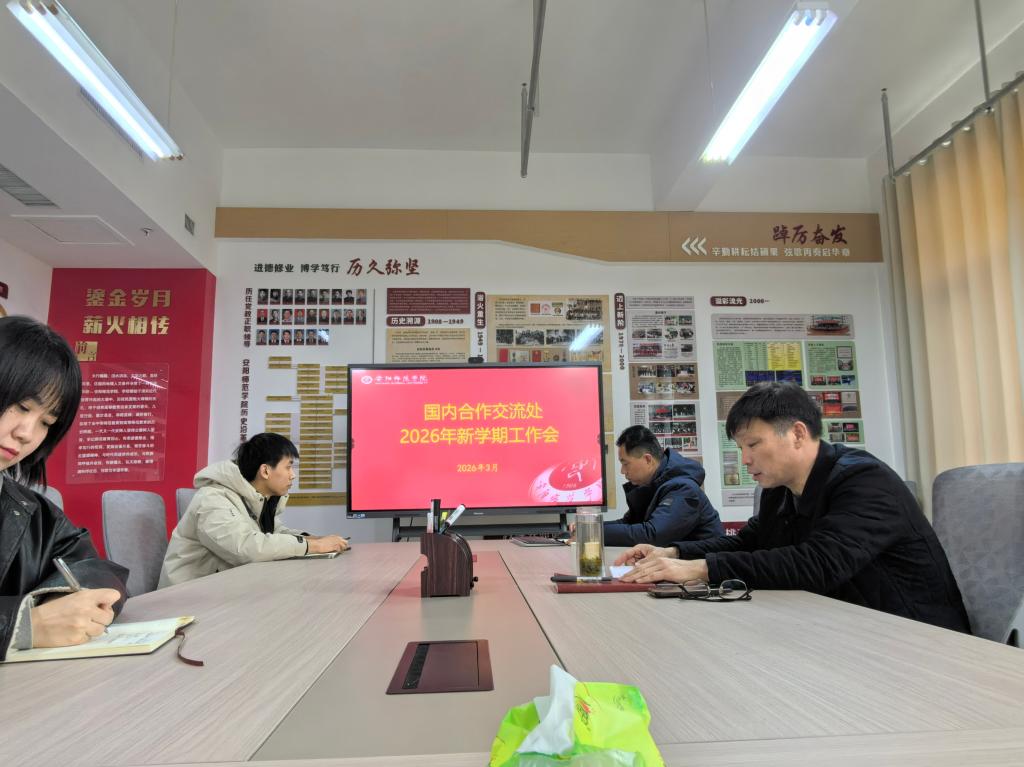 3月7日下午,国内合作交流处在勤业楼D506召开2026年新学期工作会议,系统谋划、全面部署2026年国内合作和校友工作重点任务,为新学期各项工作高质量推进明确方向。会议由国内合作交流处处长郭成立主持。